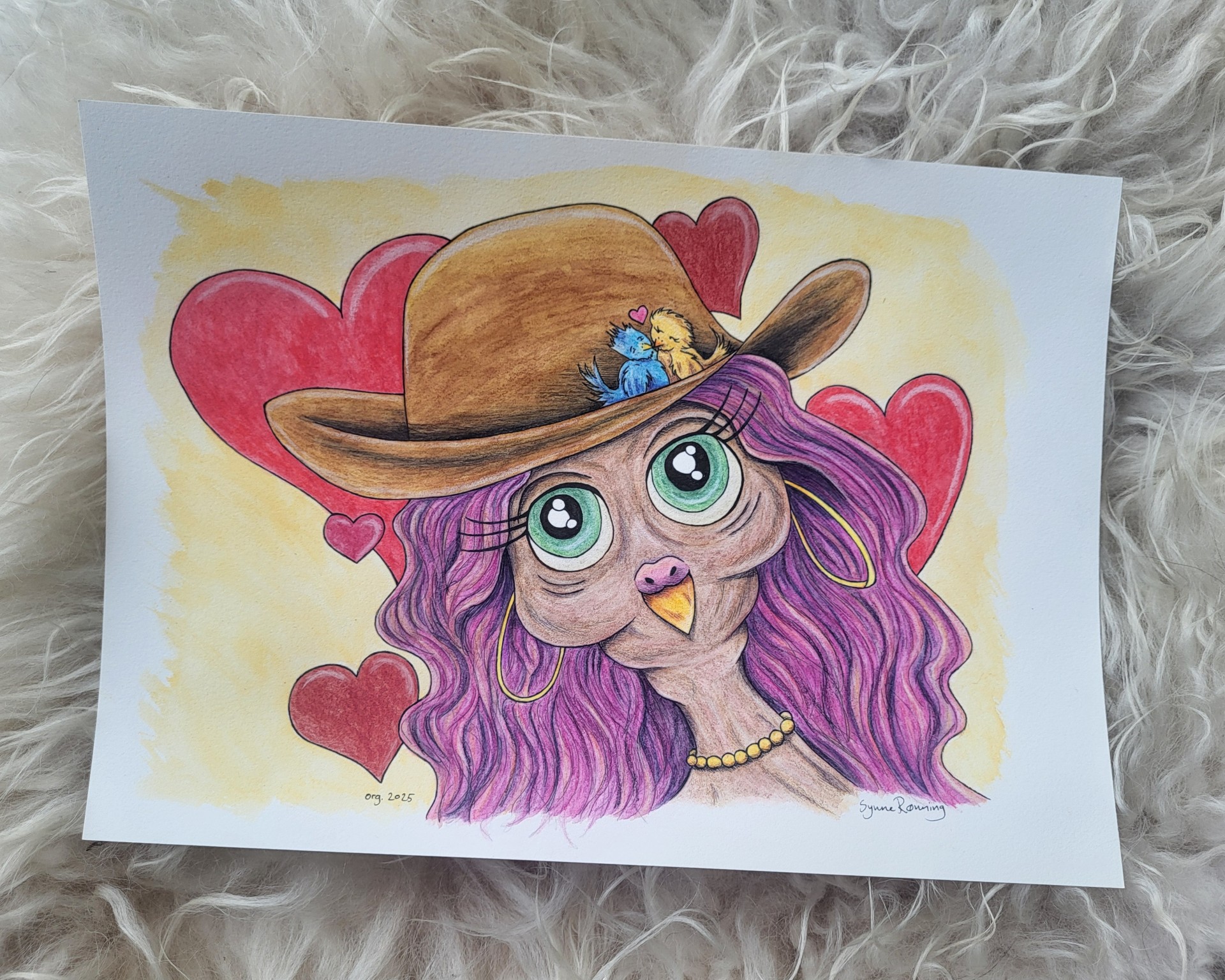 Jeg liker utrykket av denne store, omsorgsfulle (men totalt ribbede) fuglen med hatten på hodet som minner litt om et reir. I reiret sitter disse småfuglene og skal til å ta fatt på livets flytur sammen. Det er noe veldig koselig over det hele. En større historie som den som ser kan tolke seg til selv. Slike motiv er alltid morsomme.